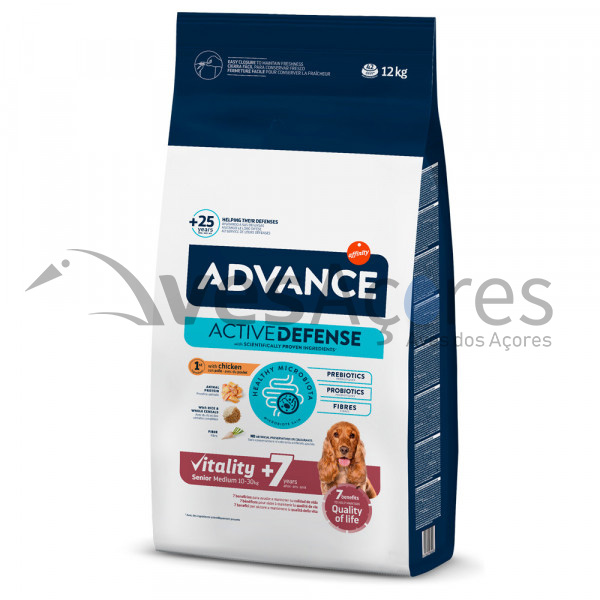 Advance Sénior 7+ Medium é um alimento seco adequado a cães seniores de porte médio (10-30 kg). Um alimento que ajuda a reforçar as defesas naturais do cão, graças a imunoglobulinas ativas e polifenóis naturais. As imunoglobulinas ativas são proteínas naturais que ajudam a manter a saúde intestinal e os polifenóis naturais, em conjunto com as vitaminas, ajudam a retardar o envelhecimento celular.